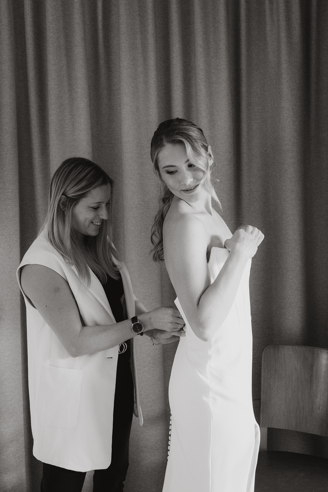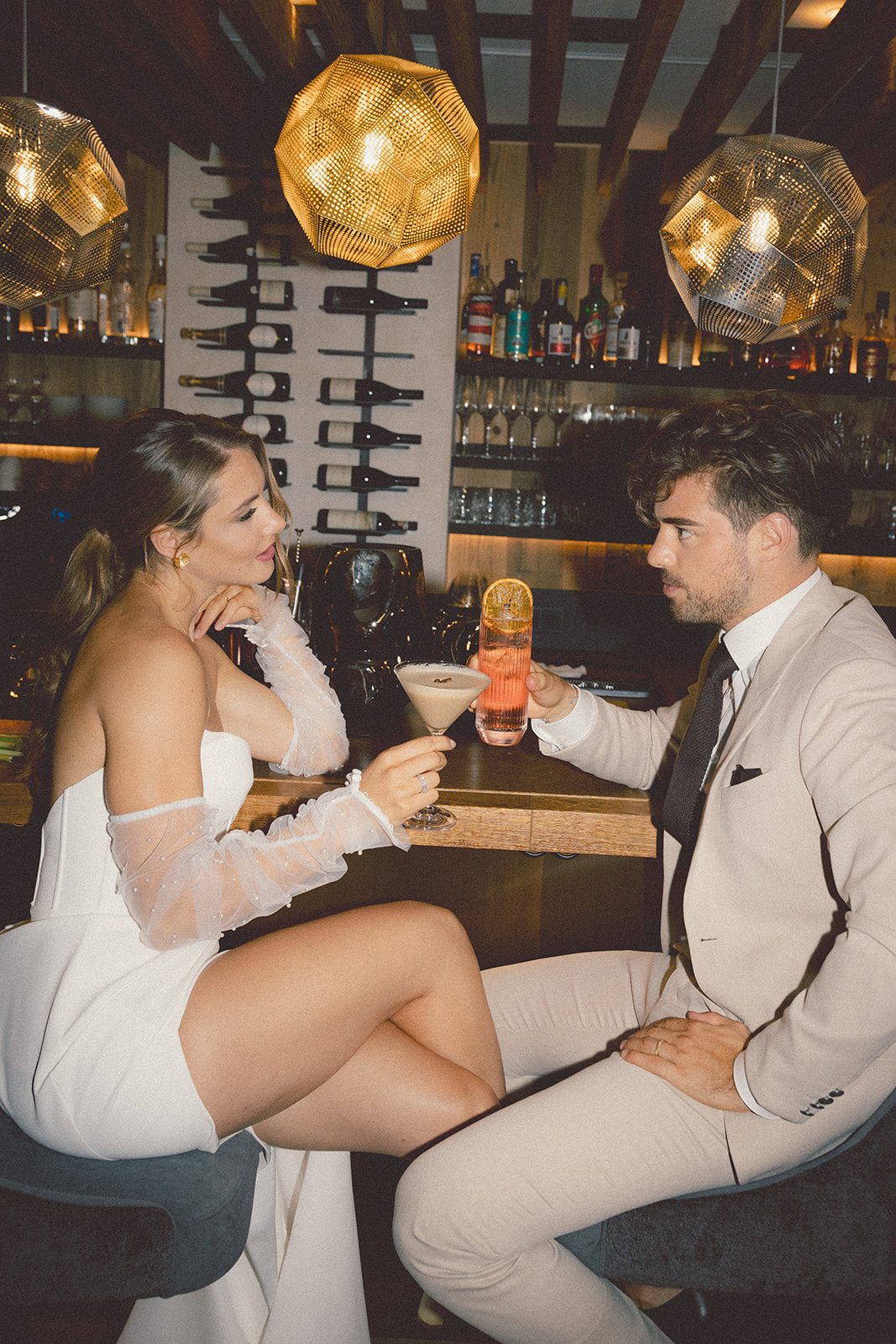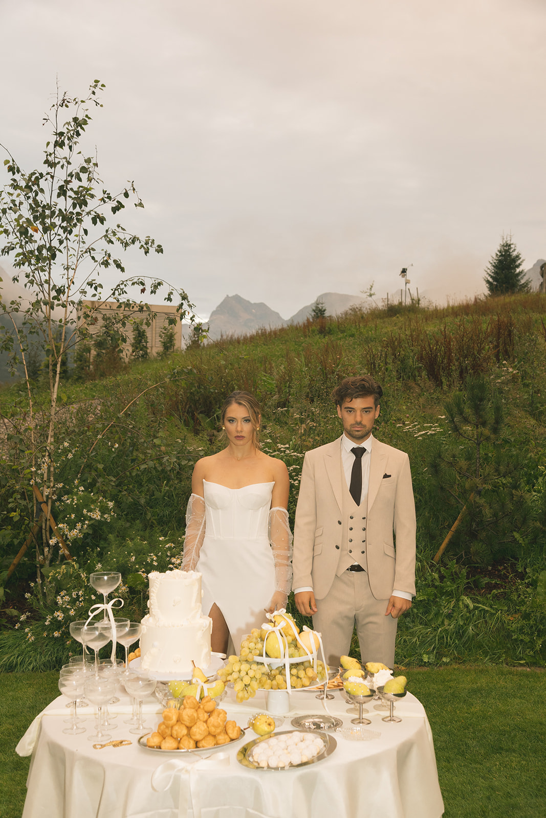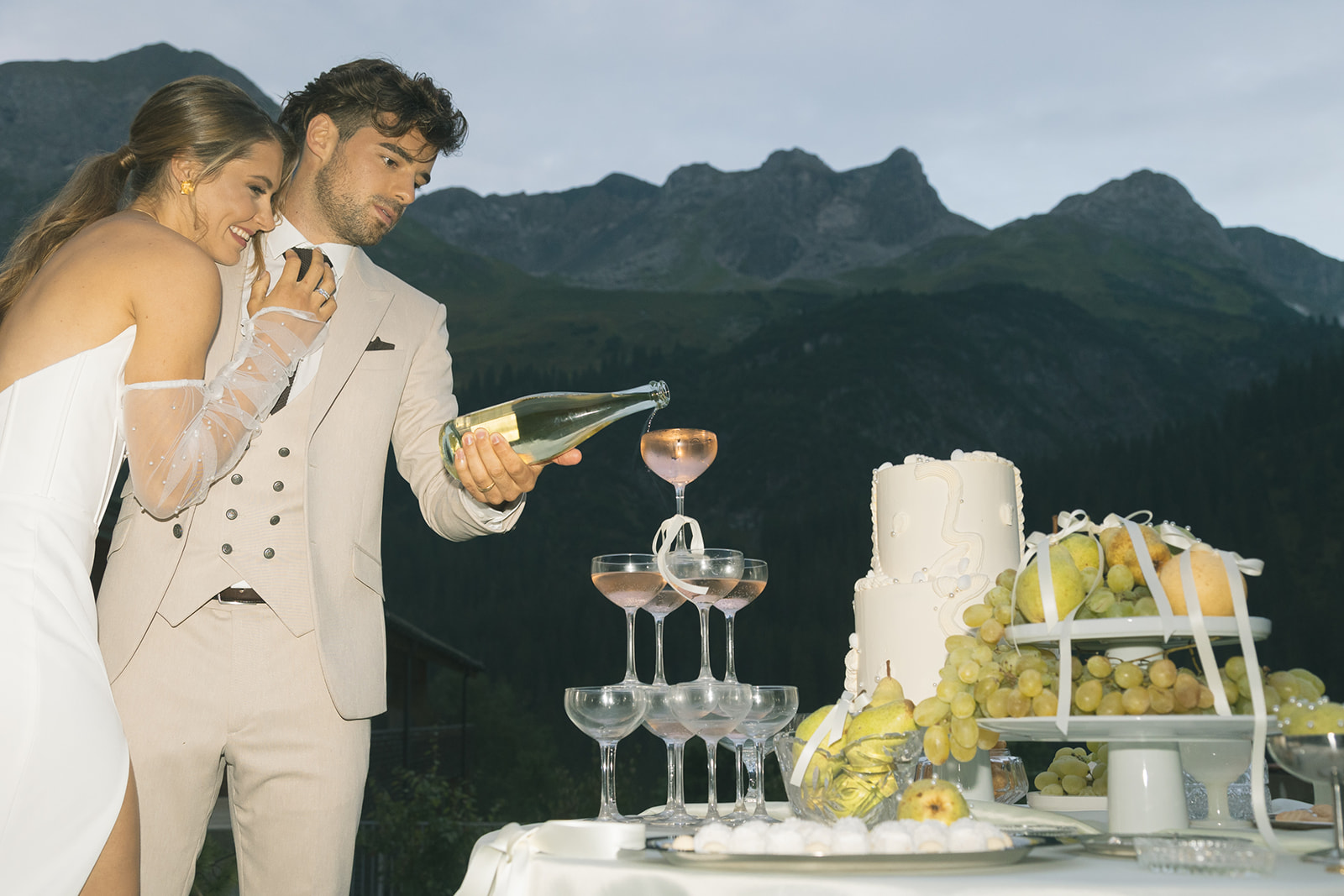 With cool and modern details, such as a special food table, pizza & cocktails at the bar and an elegant look for the bride and groom, nothing stands in the way of a modern main wedding party in the mountains of Lech.