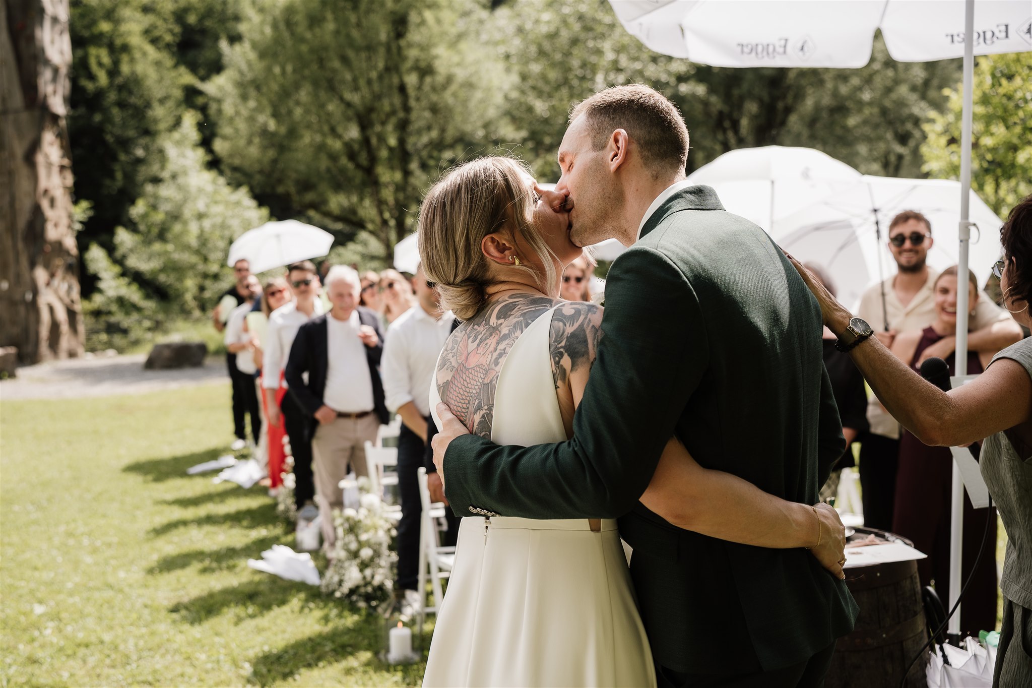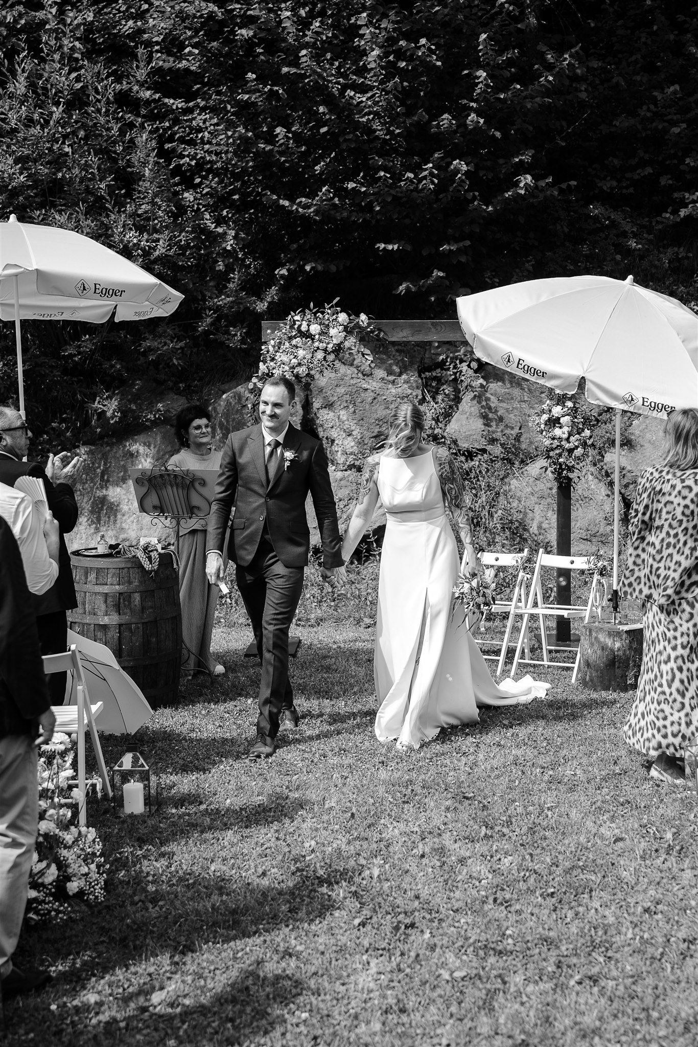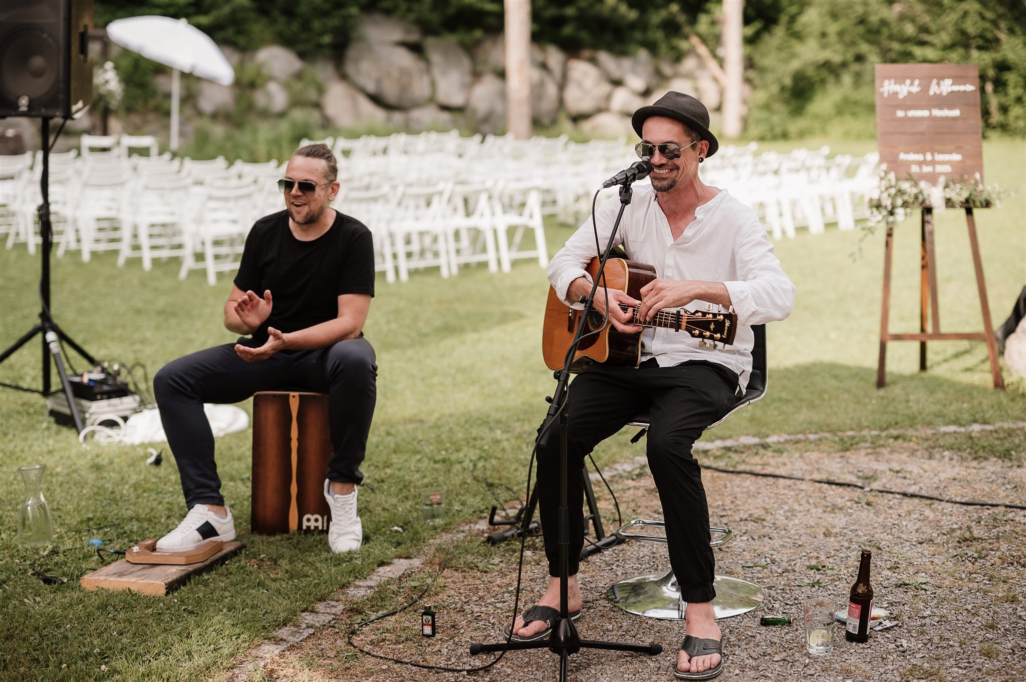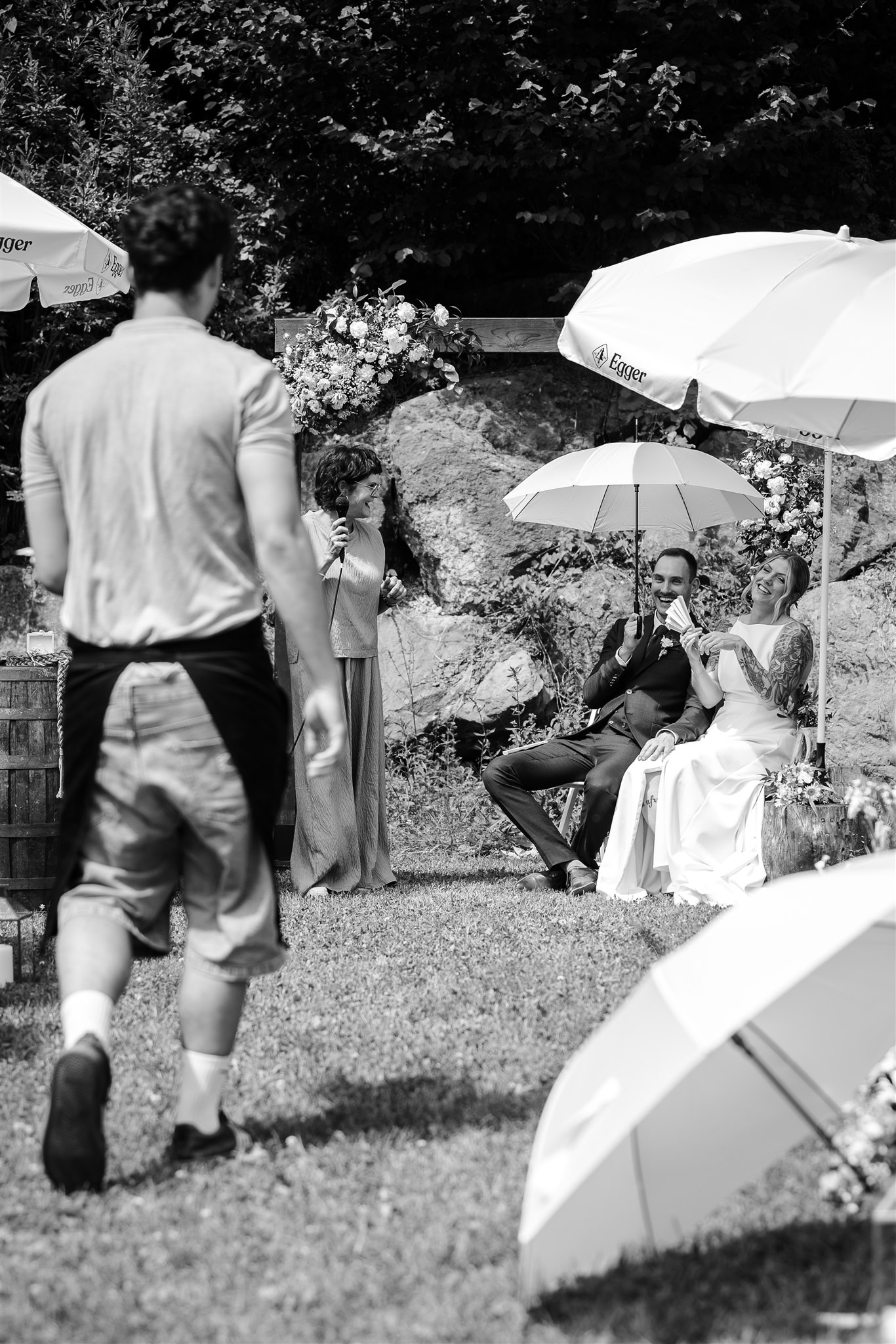The free wedding ceremony is accompanied by live music - emotional, touching and with a view of nature. Afterwards, friends and family clink glasses over an aperitif while the barbecue glows in the background.