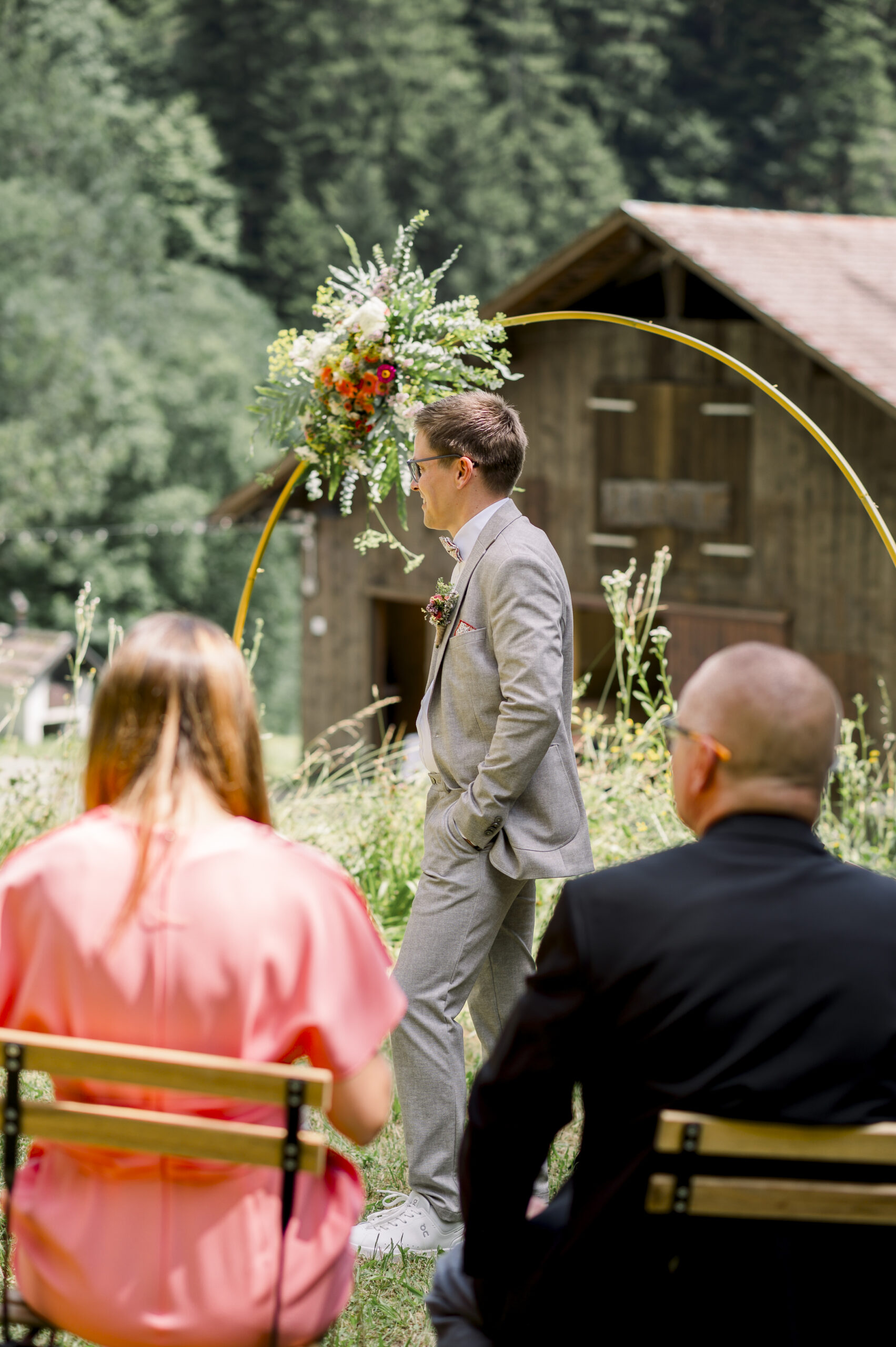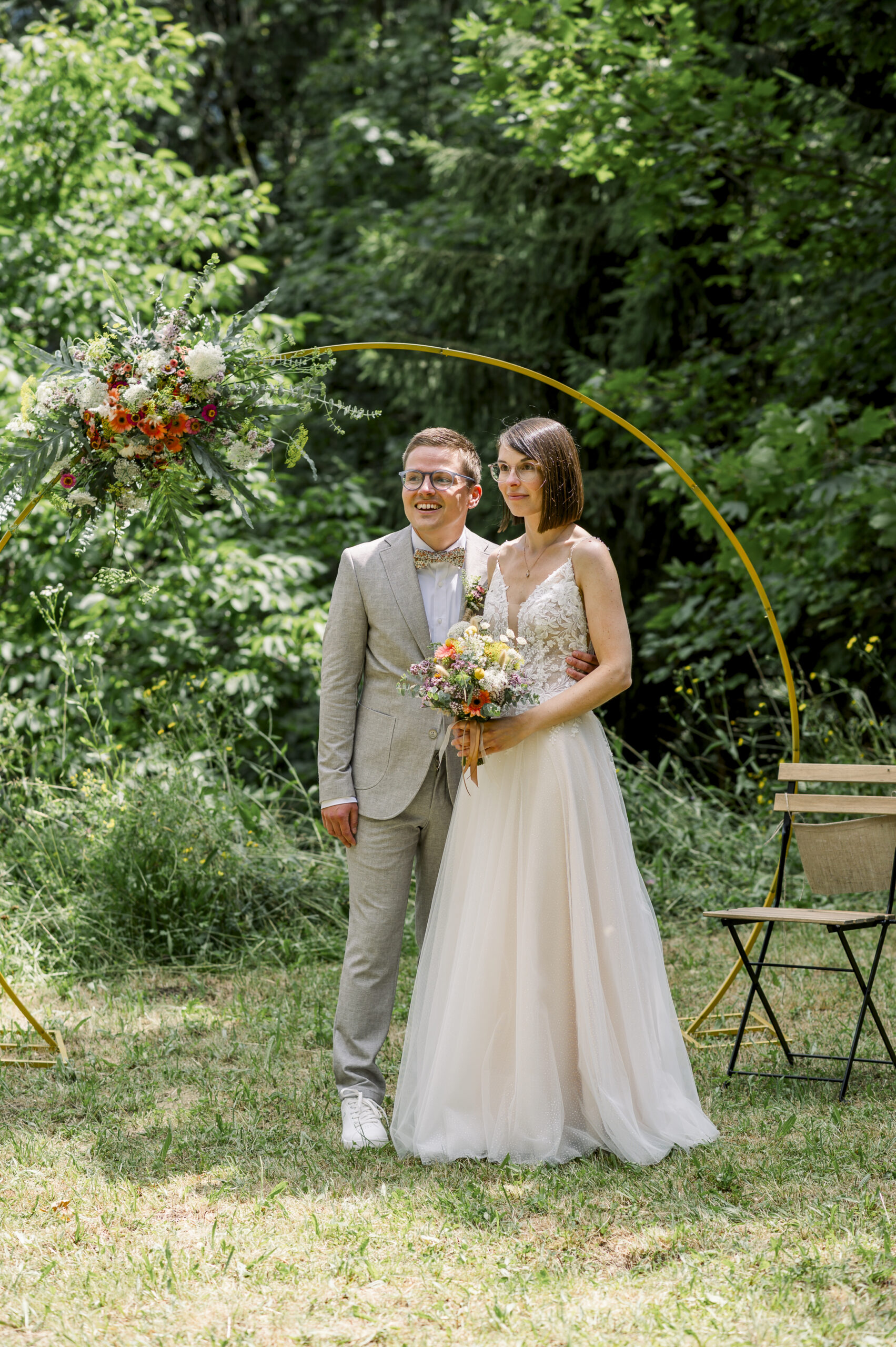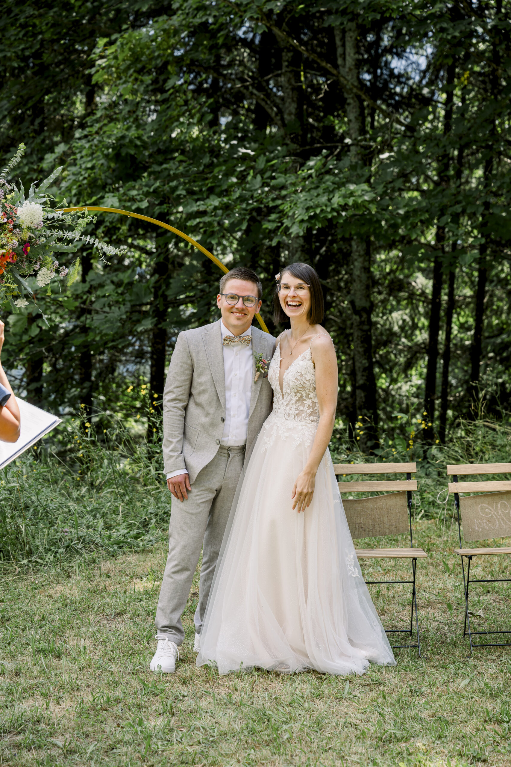 The free wedding ceremony was the emotional highlight: lovingly prepared, with colorful meadow flower decorations, cheerful, stylish - and with a special surprise. The ring was hidden under one of the chairs - and whoever found it was allowed to present it to the bride and groom. An emotional and at the same time playful moment that made for many laughs.