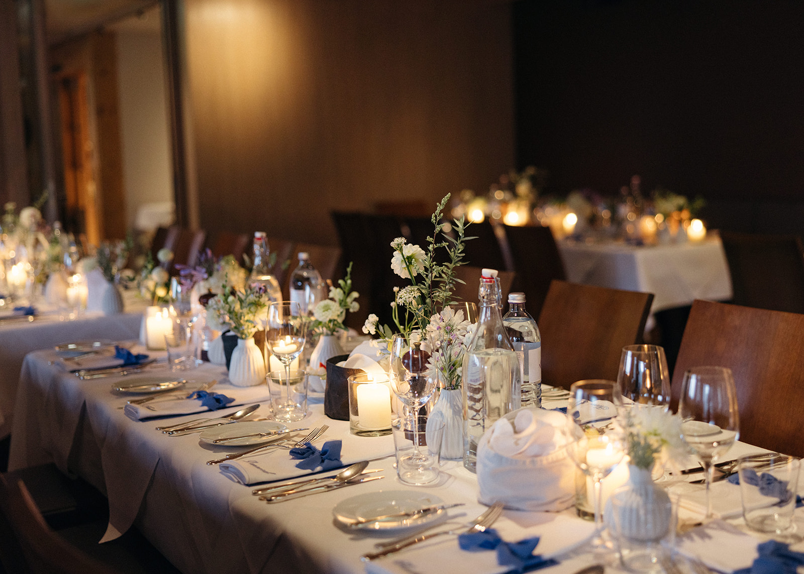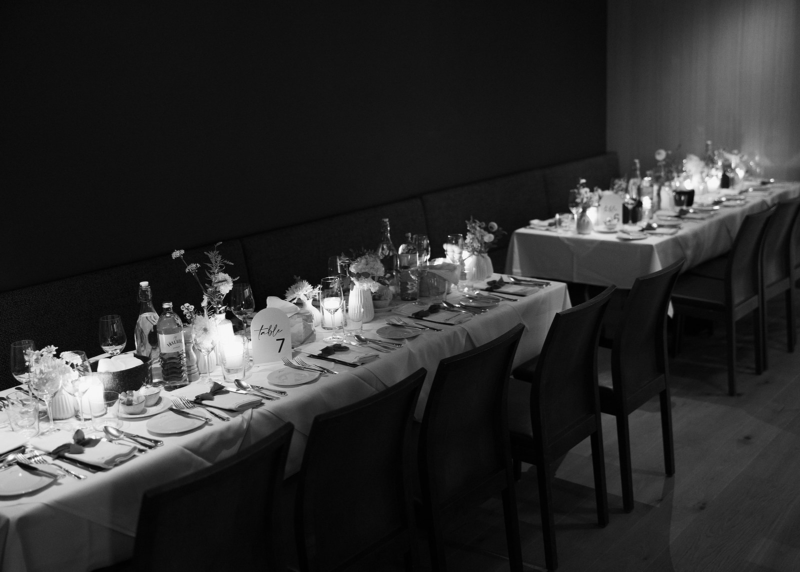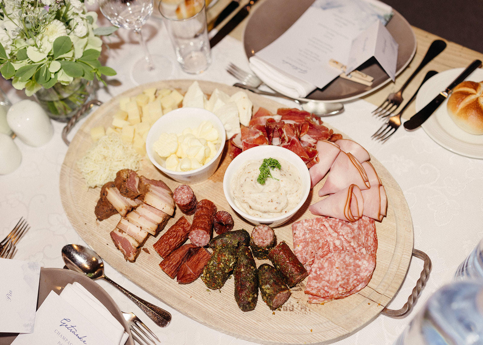 Nach einer gezielten Pause am späteren Nachmittag, kleideten sich die Gäste dem Motto entsprechend elegant – Black Tie war angesagt für das abendliche Wedding Dinner & die Party im Hotel Goldener Berg. Die Braut, gekleidet in einem traumhaften Kleid von Jesús Peiró, begeisterte mit Stil und Eleganz. DJ & Open-End-Party rundeten den Abend perfekt ab.